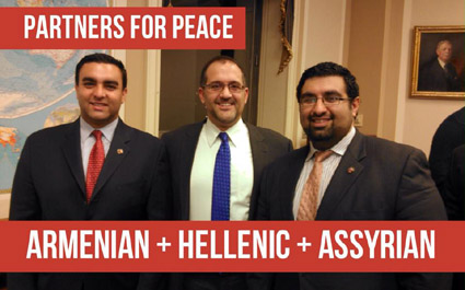 Մարդոց իրաւունքներու եւ կրօնական ազատութիւններու նիւթերուն նուիրուած ֆորում տեղի ունեցաւ օրերս Քափիթոլ Հիլի մէջ, որ լաւ առիթ մը հանդիսացաւ հայ-յոյն-ասորի համագործակցութեան յառաջիկայ զարգացման համար: Նկարին մէջ՝ Գարագաշեան, Զեմենիտիս եւ Օշանա (հայ-յոյն-ասորի) ներկայացուցիչները:
