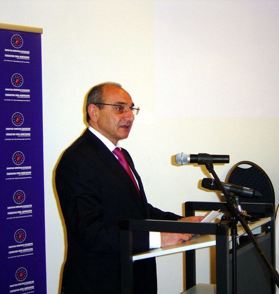 Ան աւելցուց, թէ մեր հիմնական գրաւականը կը հանդիսանայ Եւրոպական Միութեան հետ Հայաստանի մերձեցման հարցը։ «Բայց ոչինչ ամբողջական կը լինի առանց համայն հայութեան ուժին։ Օգտագործենք մեր ներուժը։ Մենք հպարտ ենք, որ այսօր գոյութիւն ունին տարածաշրջանի մէջ երկու հայկական պետութիւններ։ Այսօր աշխարհի տարբեր խորհրդարաններու ներկայացուցիչներ կþայցելեն Արցախ, ճանչնալով որ Արցախի ժողովուրդը ազատ ապրելու իրաւունք ունի եւ բոլորի ճանաչման արժանի է»,- ըսաւ ՀՀ ԱԺ նախագահը՝ եզրափակելով, թէ Լեռնային Ղարաբաղի անվտանգութենէն կախուած են Հայաստանի անվտանգութիւնն ու ապահովութիւնը։