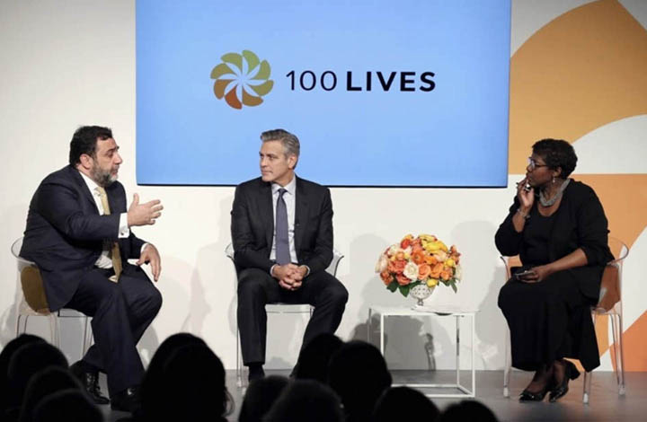 Նիւ Եորքի մէջ ձեռնարկին ներկայ գտնուեցաւ աշխարհահռչակ դերասան Ճորճ Քլունի, որ մաս կը կազմէ նաեւ «Աուրորա» մրցանակի ընտրական յանձնաժողովին: Ան իր ուրախութիւնը յայտնեց այս ծրագրին համար, նշելով թէ «պատիւ ունիմ միանալու 100 lives ծրագրին, քանի որ այն եւ իմ «Not On Our Watch» հիմնադրամի նպատակները ընդհանուր են: Երկուքն ալ կը ձգտին աշխարհի ուշադրութիւնը հրաւիրել ցեղասպանութեան թողած ազդեցութեան վրայ եւ կը փորձեն միջոցներ յատկացնել աշխարհի մէջ զանգուածային ոճրագործութիւնները դադրեցնելու համար: Բոլորս պէտք է մտահոգուինք, որ աշխարհին մէջ մինչեւ այսօր ցեղասպանութիւնները կը շարունակուին» ըսած է Քլունի, որ աւելցուցած է թէ 2016 Ապրիլ 24ին, Երեւանի մէջ ինք ներկայ պիտի ըլլայ եւ պիտի յանձնէ «Աուրորա» մրցանակը: