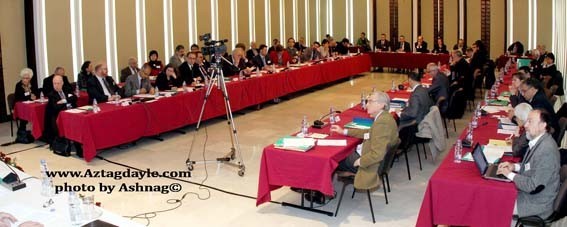 Առաջին նիստին վերջին զեկուցաբերն էր թուրք այլախոհ պատմաբան փրոֆ. Թաներ Աքչամ, որ «Հայկական կալուածներու օրինականացուած գրաւումին ետին ցեղասպանական նպատակը» խորագիրով զեկուցումին մէջ ներկաներուն հետաքրքրական տեղեկութիւններ փոխանցեց: Ան յայտնեց, որ թրքական օրէնսգիրքին մէջ գոյութիւն ունին 70-80 օրէնքներ, որոնք կը վերաբերին Թուրքիոյ Հանրապետութեան մէջ հայկական կալուածներու հարցին: