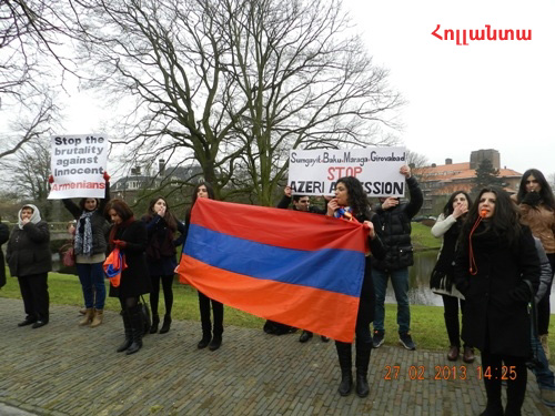 Հոլլանտայի Հայ Դատի Յանձնախումբի նախաձեռնութեամբ Փետրուար 27-ին տեղի ունեցաւ ցոյց Ատրպէյճանի դեսպանութեան շէնքին դիմաց՝ ընդդէմ ատրպէյճանական ռազմատենչ քաղաքականութեան եւ սումկայիթեան ջարդերու 25-ամեայ տարելիցի կապակցութեամբ: