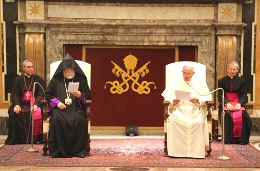 Ֆրանսիս Պապը անդրադարձաւ Հայոց Ցեղասպանութեան եւ յիշեց, որ հայ ժողովուրդի պատմութիւնը լեցուն եղած է հալածանքներով եւ նահատակութեամբ: Պապը նաեւ յիշեց Քրիստոնեայ համայնքներու դիմագրաւած մարտահրաւէրները Միջին Արեւելքէն ներս եւ ողջունեց անոնց միասնականութիւնը եւ Միջին Արեւելքին կառչած մնալու հաւատարմութիւնը:
