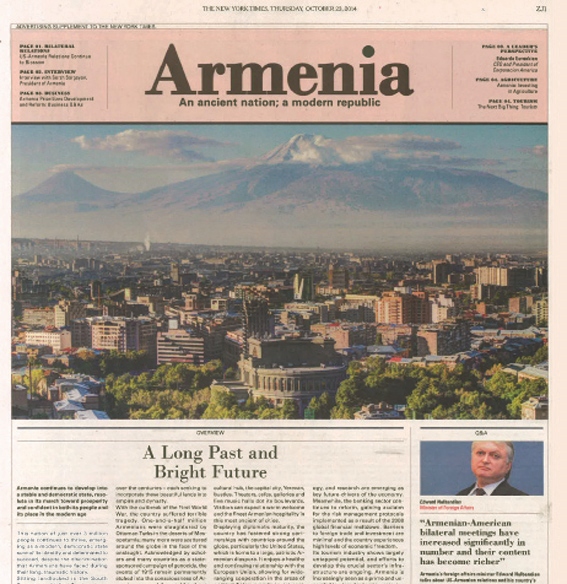 Հոկտեմբեր 23ին լոյս տեսաւ «Նիւ Եորք Թայմզ» թերթի չորս էջերէ բաղկացած յաւելուածական հրատարակութիւնը, որ ամբողջութեամբ նուիրուած էր Հայաստանի: