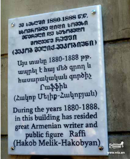 Մարտ 13-ին Վրաստանի մէջ ՀՀ դեսպանութեան նախաձեռնութեամբ եւ Թիֆլիսի քաղաքապետարանի աջակցութեամբ Թիֆլիսի քաղաքի Սոլոլակ թաղամասի Ճոնքածէ 3 հասցէին, ուր բնակած է հայազգի տաղանդաւոր գրող եւ հասարակական գործիչ Րաֆֆին (Յակոբ Մելիք-Յակոբեան), տեղի ունեցաւ անոր յիշատակին նուիրուած յուշատախտակի բացման արարողութիւնը: